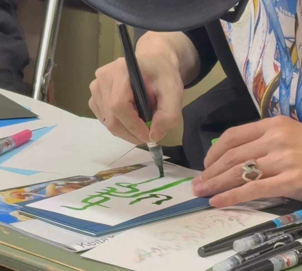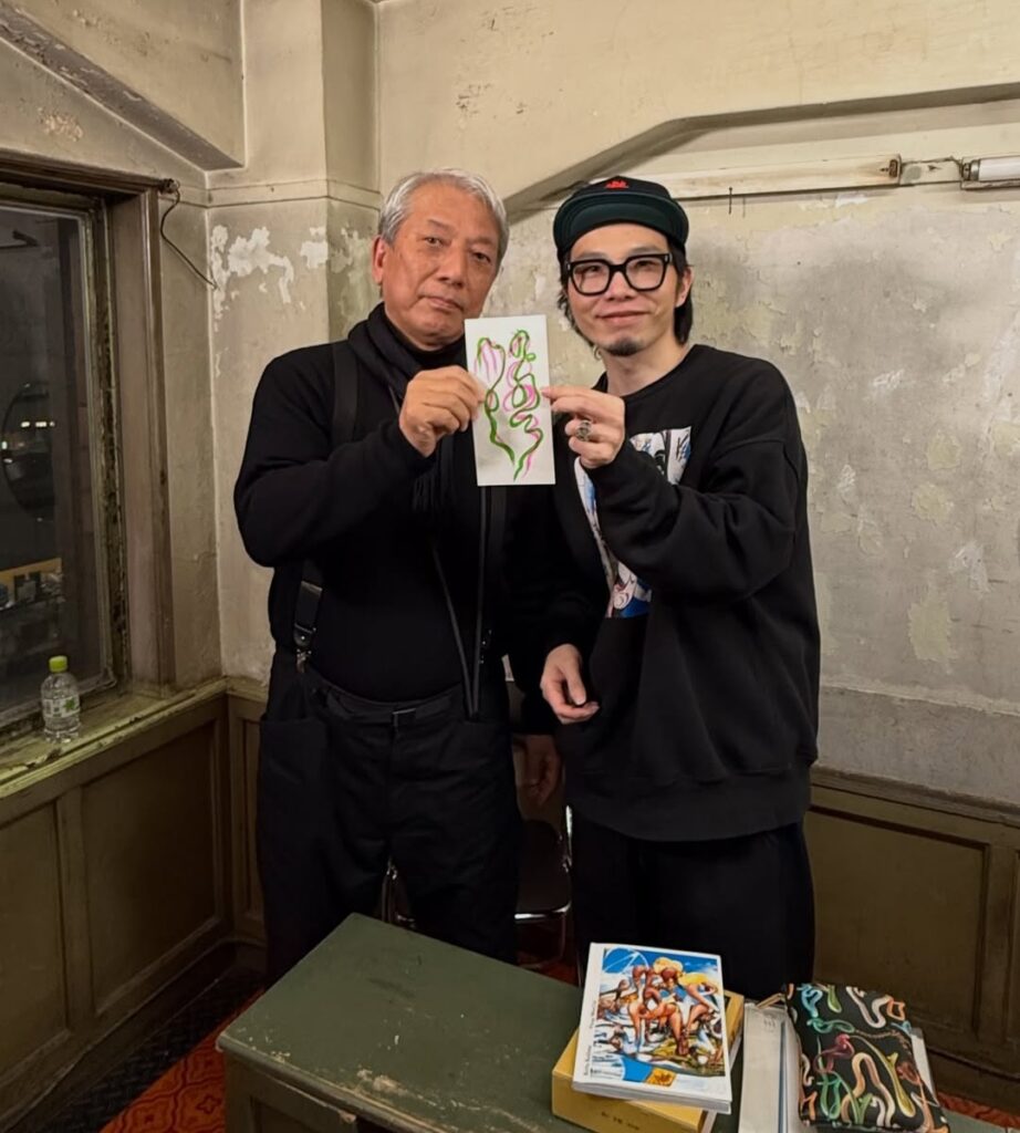 トークの後半は、その場での制作、ライブワークへと移行した。白川静の字典『字統』から後藤がお題の字を選び、児嶋が様々な色の筆ペンを手に、紙の上へと文字を解き放っていく。高校まで書道を学んだ身体知が、デジタルと理論を行き来してきた言語の探求と、ここで静かに交わった。