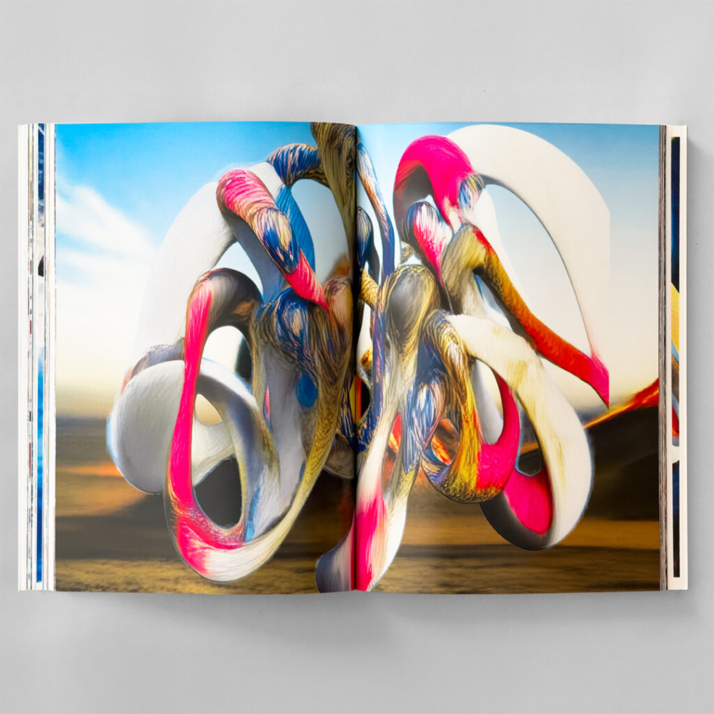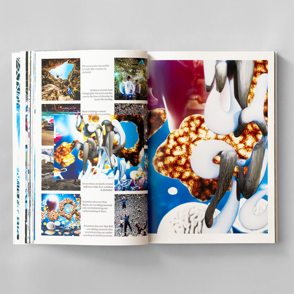 児嶋: その日のニュースをAPIで10本ほど取得し、文節単位でバラバラに分解します。それをシャッフルして再結合すると、文法的に少し歪んだ、でも辛うじて意味が読み取れるような文章が生まれる。それをプロンプトとして画像生成AIに入力する。奇妙な文章であっても画像は生成されてしまう。そして、できあがった画像は、まるで実際の出来事のように「真実らしさ」を帯びてくる。これを朝・昼・晩と3ヶ月間繰り返し、膨大な画像を生成しました。最終的に「Virus Signal」という3Dの文字を乗せて動画を作り、動画をキャプチャーしたもので本を作りました。